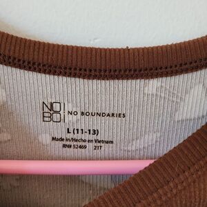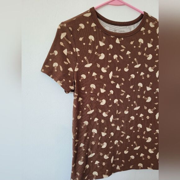 Super cute top in a woodland botanical mushroom print and chocolate brown color. Ribbed material. Stretchy and super comfy. Great condition. Juniors size L 11-13. 23 inches long 17 inches underarm to underarm laid flat.