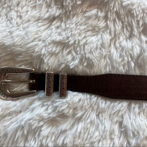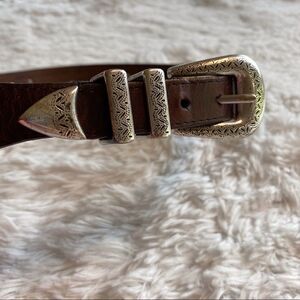 Brown Oil Tanned Cowhide Belt With Southwest Style Silver Hardware. Excellent used condition. Measures approximately 37.5” long and 1” wide.