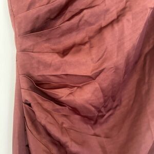 This stunning brown gown is designed with a ruched bodice and a dramatic side slit, making it perfect for weddings or cocktail events. The one-shoulder neckline adds a sophisticated touch, while the sleeveless design ensures comfort and elegance. Its sheath silhouette and floor-length style create a graceful and eye-catching look for any formal occasion.