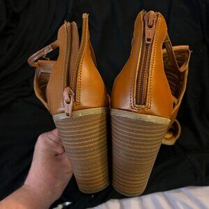 Light Brown Merona sandal with zipper back closer, and two straps per side (one with elastic for comfort fit), and an open toe. Very easy fit and in excellent condition.