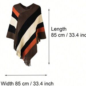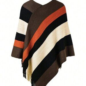 Brown Orange Casual Women's Multi-Color striped Tassel Knitted Shawl poncho