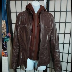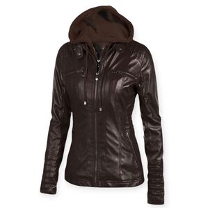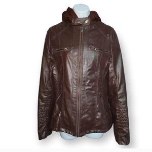 NWOT Brown faux leather jacket made with durable PU faux leather and features a detachable hood. Never worn, in excellent condition.
