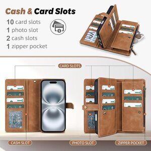 🆕Brown PU Leather Wallet Case for iPhone 16 – Magnetic Detachable 6.1" Cover