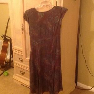 Brown Paisley Dress. The dress has pinks and blues in it.