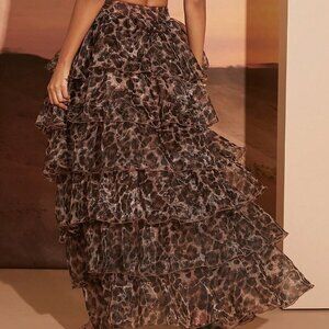 Brown Party Womens Leopard Print Pleated Ruffle Layered Skirt