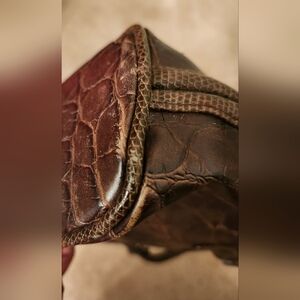 Stylish vintage brown patchwork handbag with unique textures. Features dual handles for easy carrying. The brown faux leather patchwork design will add a touch of bohemian flair to any outfit. It also has a retro vibe, making it the perfect accessory for a day out or a special occasion. The interior bag is made from vinyl.