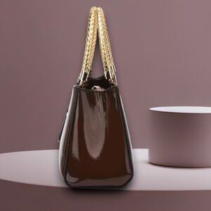 Elegant and eye-catching, this brown patent faux leather handbag features stunning gold braided handles and a structured silhouette designed for both everyday wear and special occasions.