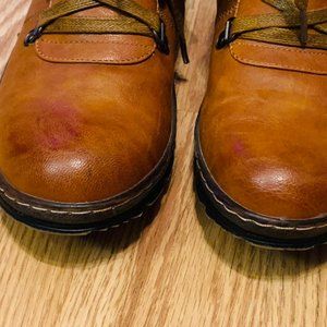 Minimum wear and tear (e.g. dark brown scuff marks on top of toe box). Wear and tear coloring depicted as reddish in picture, but is dark brown.