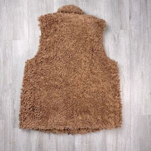 Size M faux fur shearling vest. Zipper closure. Pockets at sides. Buckle accent. Chest 21in. Length 25in.