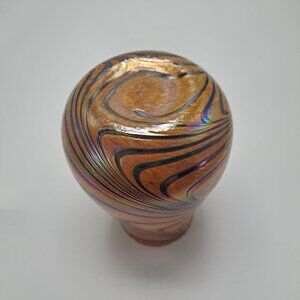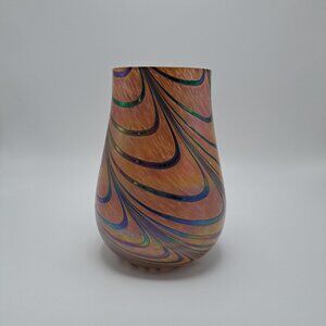 Stunning vase with a mesmerizing iridescent finish featuring intricate pulled feather designs. Perfect for adding elegance to any setting.
