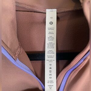 Stylish brown pullover featuring a quarter-zip design with purple accents. Perfect for casual wear.