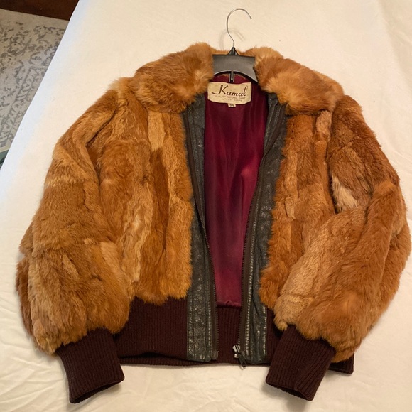 Women’s size small rabbit fur jacket. It’s authentic. It’s in pretty good condition. The leather is starting to wear some