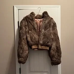 Stylish brown faux fur jacket with a cozy design. Perfect for adding warmth and style to any outfit.