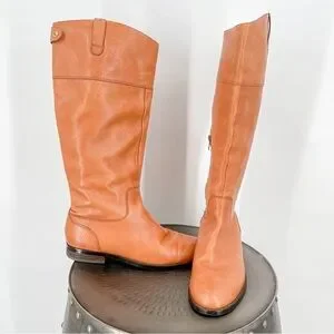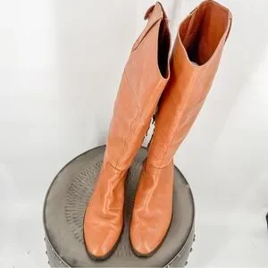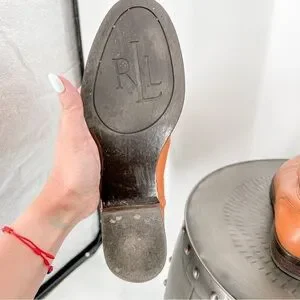 Brown Ralph Lauren Riding Boot. Camel leather riding boot. Classic fit, classic style. Partial side zip on inside side of the boot. Gold accent snap at the top. In great condition.