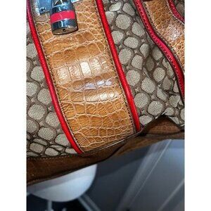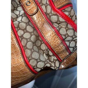 Brown & Red Circle Printed Shoulder Bag With Faux Croc Leather Straps & Padlock