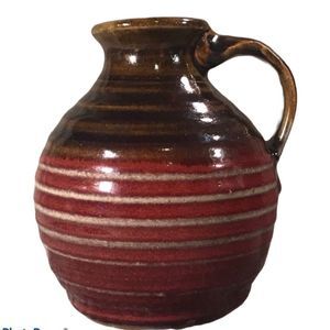 Very cute little brown and red (maroon) ridged, highly glazed stoneware jug. The combination of 2 tone autumn colors is unusual, as well as the contrast on the ridges. It measures 4 1/2” tall x 3 3/4” wide. This is an adorable accent piece alone, but would also be so pretty with a sprig of flowers