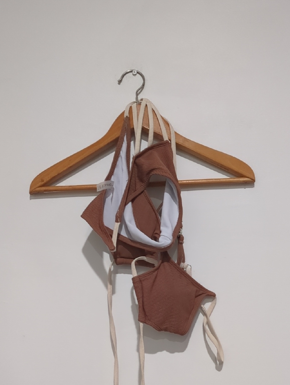 Two-piece ribbed bikini in warm brown with cream straps. Removable padding and adjustable ties. Simple, flattering silhouette. Soft textured fabric.