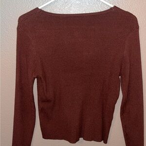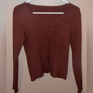 Stylish brown ribbed cardigan with button-up front. Perfect for casual wear.