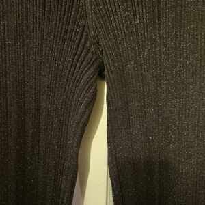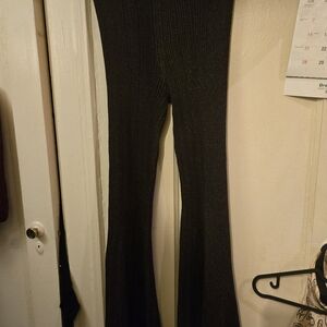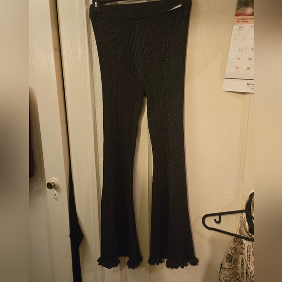 Soft ribbed knit pants with a fitted waist. Flared legs with ruffled hems. Stretchy and comfortable. Versatile black color for easy styling.
