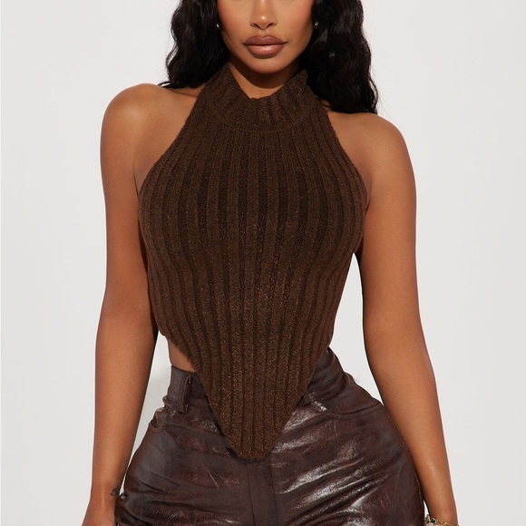 Elevate your style with this chic brown ribbed halter top. Perfect for any occasion, it offers a flattering fit and a trendy design.
