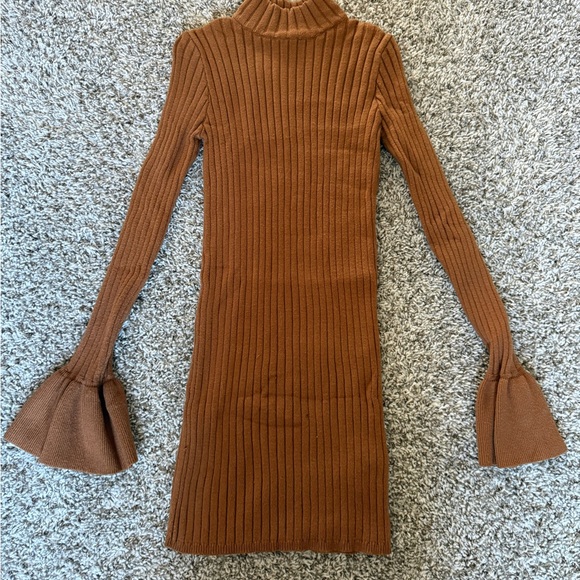 This brown ribbed knit dress is perfect for any occasion. Its stylish design and comfortable fit make it a fall must-have in your wardrobe.