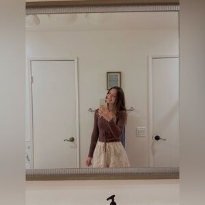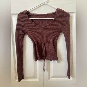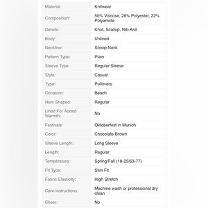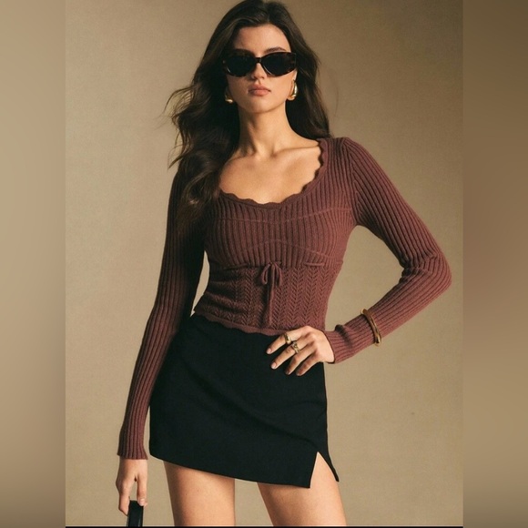 Stylish brown ribbed knit sweater with scalloped edges. Perfect for a chic look.