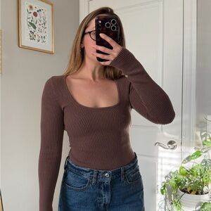 Chic chocolate ribbed bodysuit with scoop neckline. Long sleeves for versatile wear.