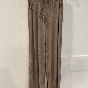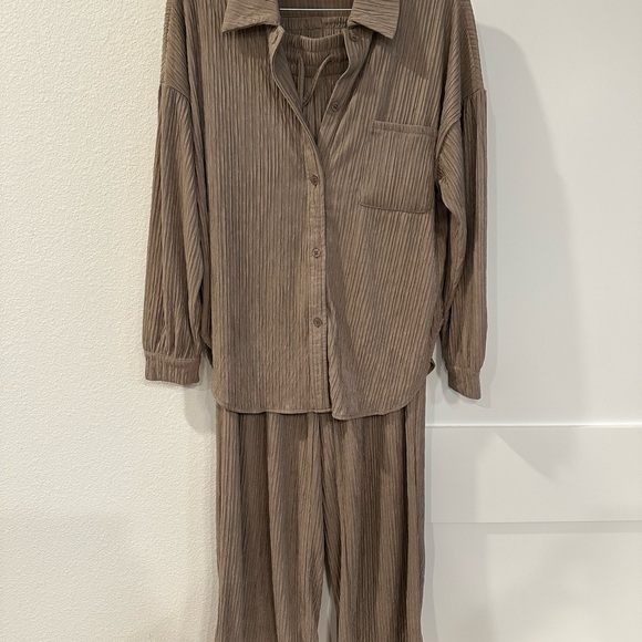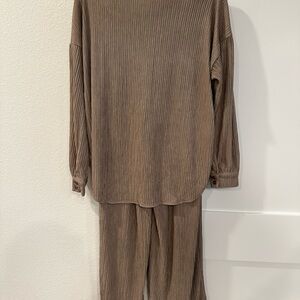 Comfortable brown ribbed lounge set. Includes a button-up top and matching pants. New without tags. Never worn.