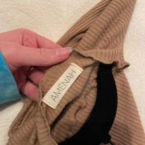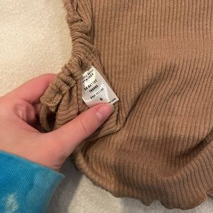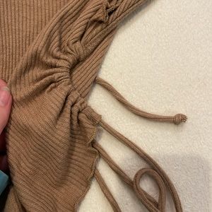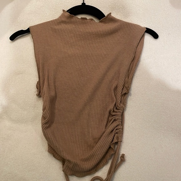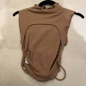 Cowl neck brown open back tank. DrW string ties in the back so it is adjustable. Little ruffle on neck and bottom. From Amenah, a boutique in Laguna Beach, CA