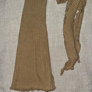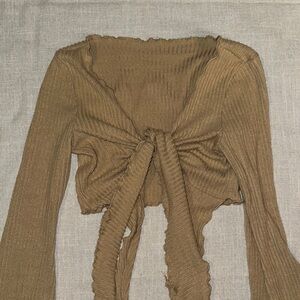 Stylish brown ribbed top with a tie-front design. Features long sleeves and a cropped fit.