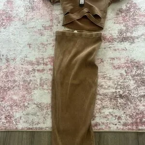 Stylish brown ribbed two-piece set. Includes a top and matching pants. Perfect for casual outings.