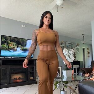 Stylish brown ribbed two-piece set featuring a crop top and high-waisted pants. Perfect for casual outings. 2available S-M