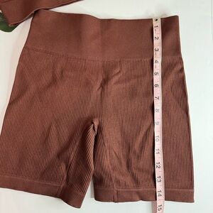 Stylish brown ribbed two-piece set. Includes a crop top and high-waisted shorts. Perfect for casual wear.