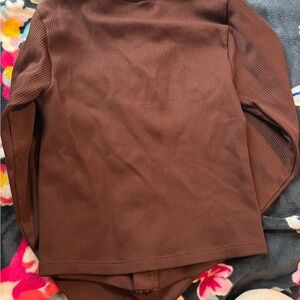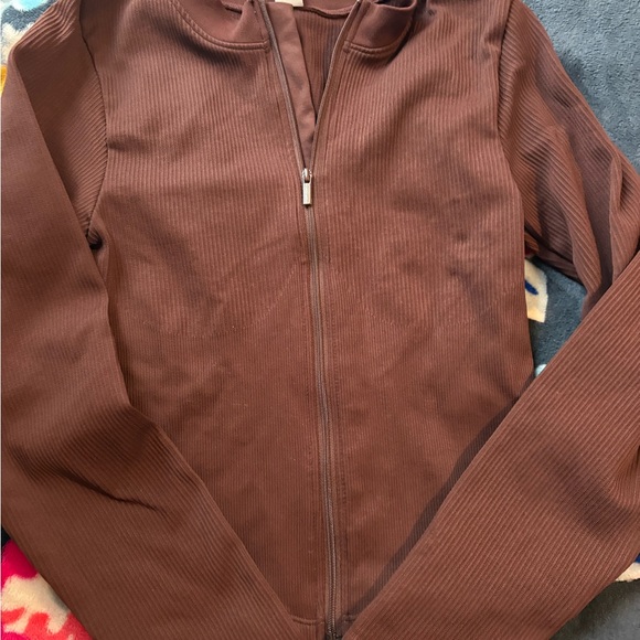 Stylish brown ribbed jacket with a zip-up front. Perfect for layering. Brand Unknown but tight fitting