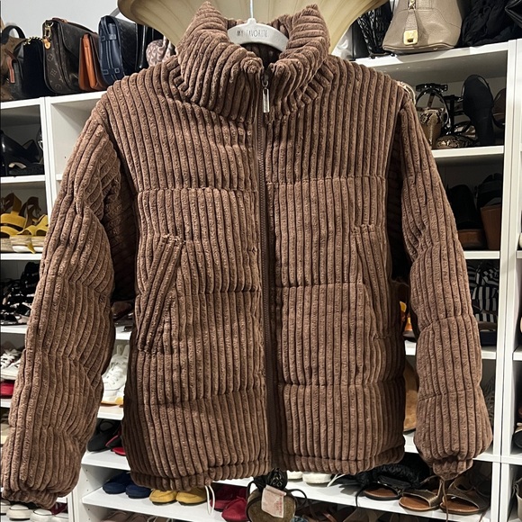 Cozy brown ribbed jacket with a zip-up front. Perfect for chilly days.