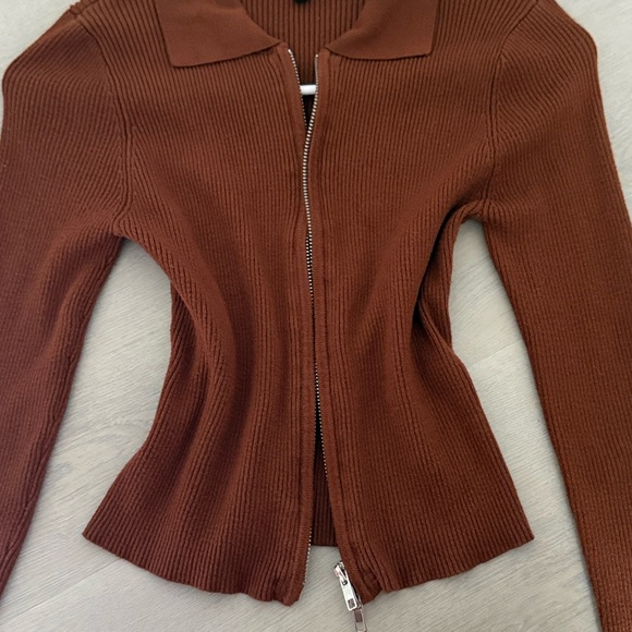 Brown Ribbed Zip-Up Sweater