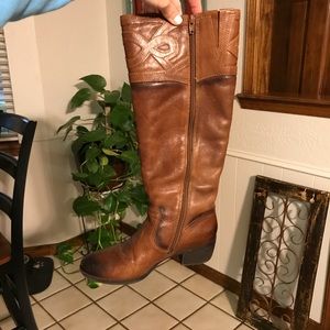 Tall brown/black distressed riding boots. The pattern at the top is stitched leather. They are very comfortable as the brand is “Nurture.” They have about a 1 1/2 inch heal.