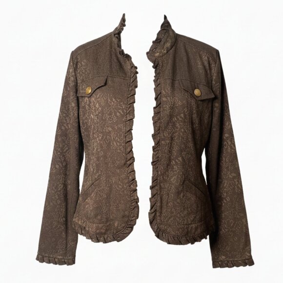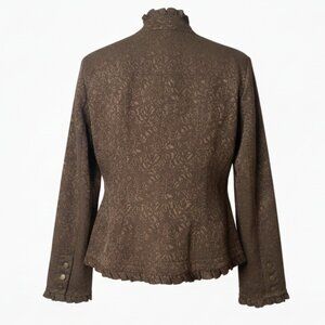 This luxe, mid-weight brown two-toned rose patterned jacket designed with a regular fit and classic notched lapels for timeless appeal. Accented with dull brass buttons on the double-breasted front and cuff straps for an elevated finish. The perfect transitional layering piece.