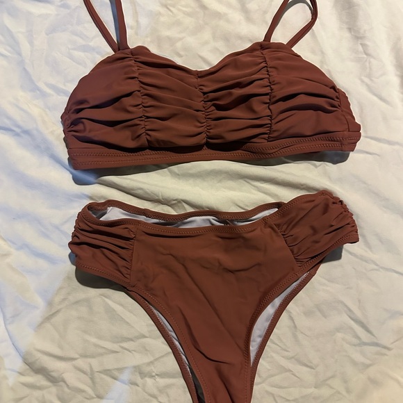 Stylish brown bikini set. Features ruched detailing. Perfect for the beach or pool.
