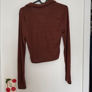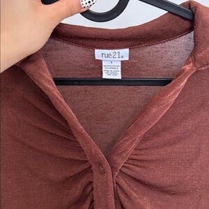 Chic dark brown top with ruched detailing. Super soft and comfy. Easy way to elevate a casual fit.