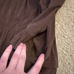 Feminine and flattering, this brown off-the-shoulder dress features a ruched bodice with soft ruffle detailing and puff sleeves for a romantic, elevated look. The cinched waist and flowy skirt create a beautiful silhouette that’s perfect for dressing up or down.