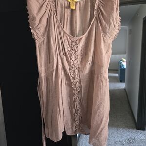 Soft brown sheer linen baby doll yop with ruffle button-front detail. Light puff sleeves and a fitted waist. Simple, feminine silhouette ready to wear.