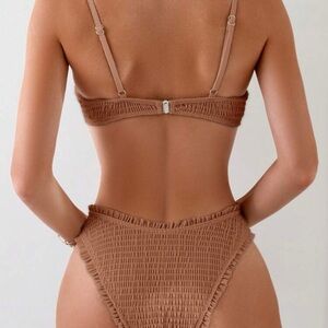 Stylish brown bikini set with ruffled details. Perfect for a chic beach look.