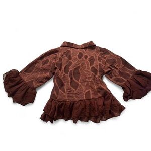 brown ruffle blouse. Features a textured abstract pattern, button front, ruffle hem, and flared ruffle sleeves. Lightweight with a flowy, feminine fit.
