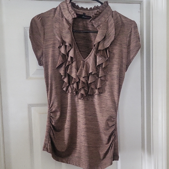 Elegant brown ruffled top with a stylish design. Perfect for any occasion. A little piling around tag. Very light discoloration at arm pits. See photos