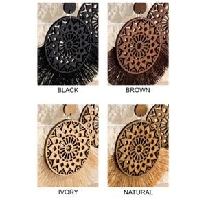 Brown Rustic Natural Wood Filigree Round Tassel Boho Bohemian Dangle Earrings