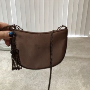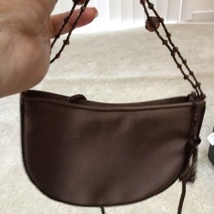 A small simple yet elegant sassy brown satin purse. Has crystal handles or can be worn long with cord strap. Has little tassel of brown beads hanging as a decoration, fun! Never used