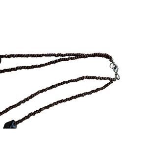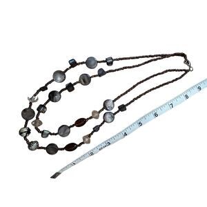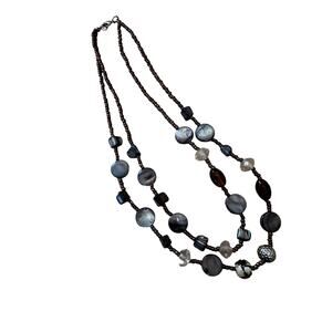 Lovely two strand vintage beachy necklace. It has warm coppery seed beads mixed with mother of pearl beads in chip and round styles that have been dyed brown/grey mixed with a few other complimentary toned beads. This is such a versatile piece and in great condition! Measures 20” on the longest strand, not adjustable.