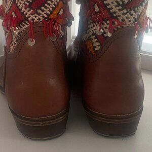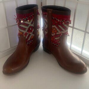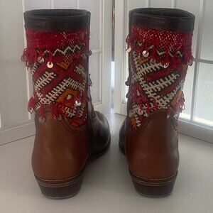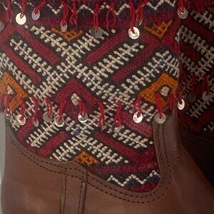 Brown Short Handmade Moroccan Real Leather with Antique Weaving Inset Sz. 9.5 A real find!!! Real Leather inside and out with beautiful handwoven antique inset with fringe and sequins. In almost new condition. Only worn twice. These boots are one of a kind and command attention and compliments, Real Calf Leather - Authentic Kilim Berber Carpet.