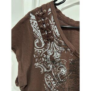 brown graphic tee, short sleeve shirt, lace-up neckline, paisley print tee, casual women’s top, lightweight v-neck shirt, medium size top, studded detail shirt, brown polyester top, rhinestone accents tee, comfortable everyday tee, unique graphic des
